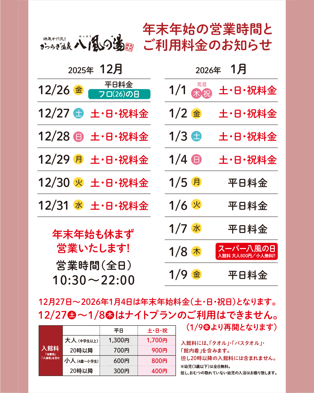 ◎12月27日〜2026年1月4日は年末年始料金(土・日・祝日)となります。