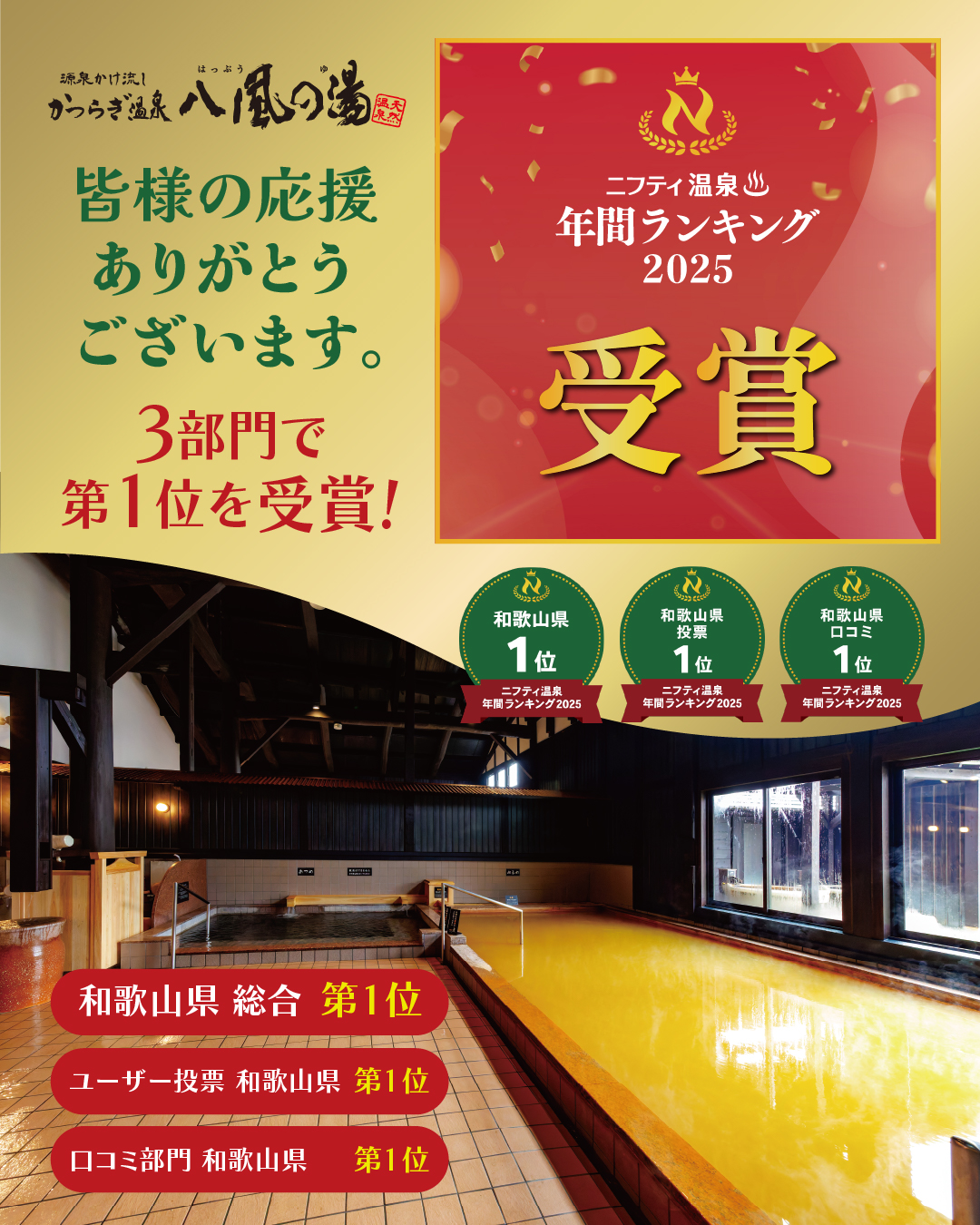 ニフティ温泉 年間ランキング2025にて、 【3部門で第1位】を受賞