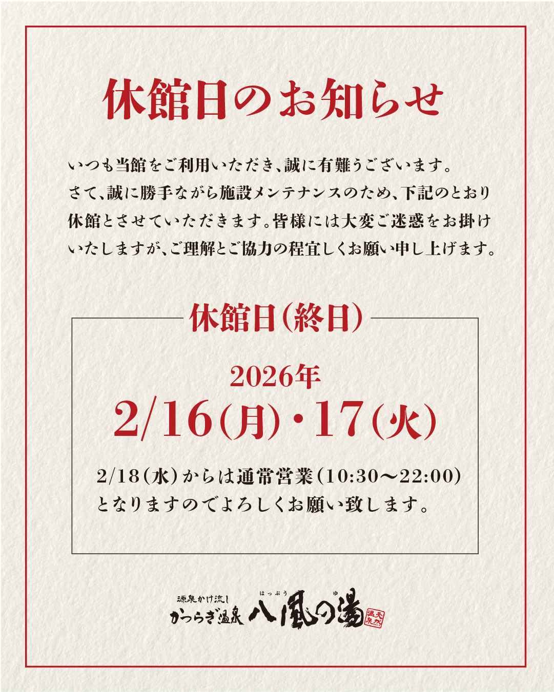 📅 休館日: 2026年2月16日(月)・17日(火)