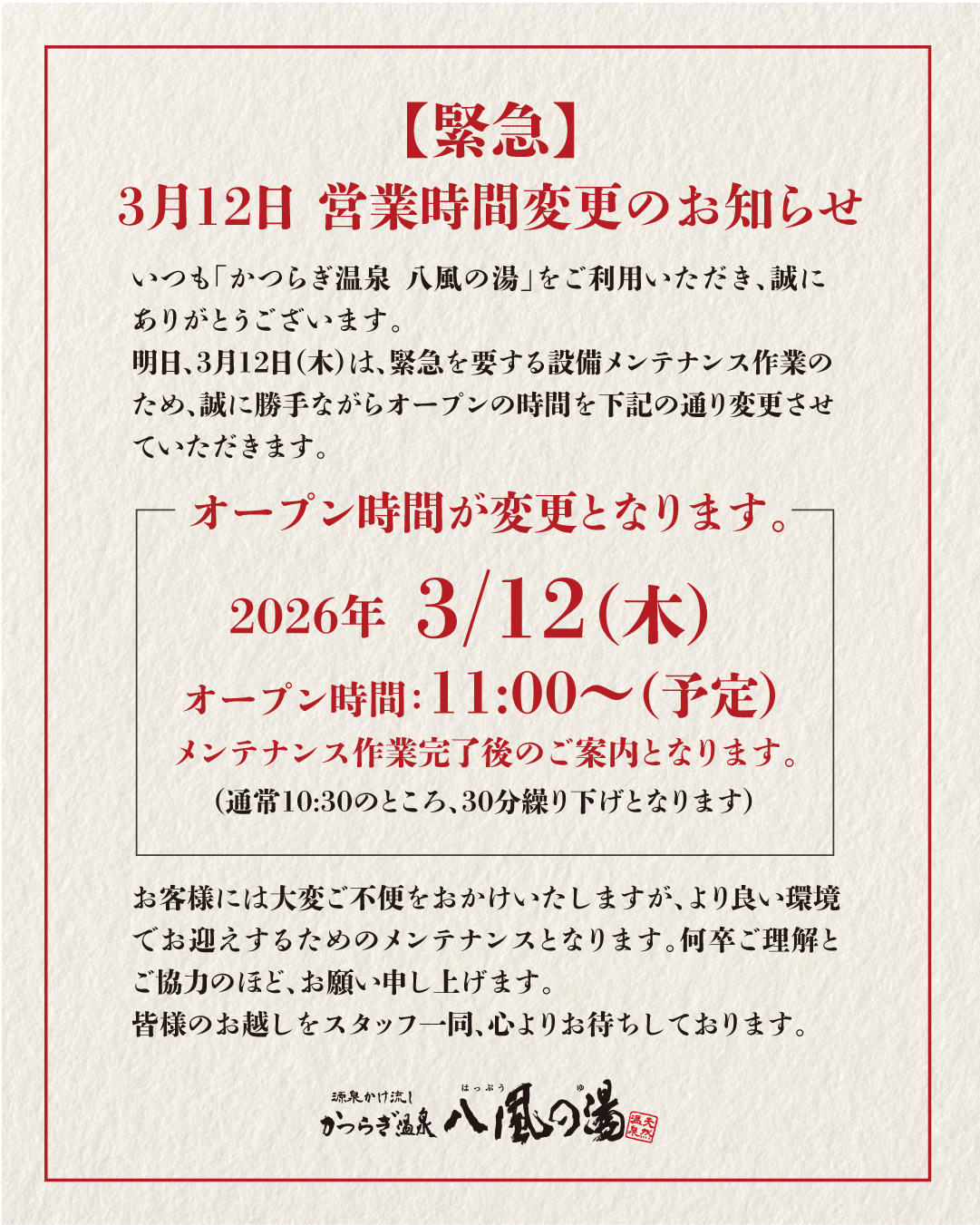 【緊急:3月12日 営業時間変更のお知らせ】